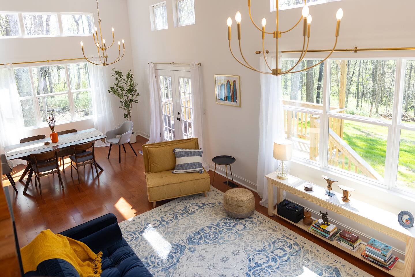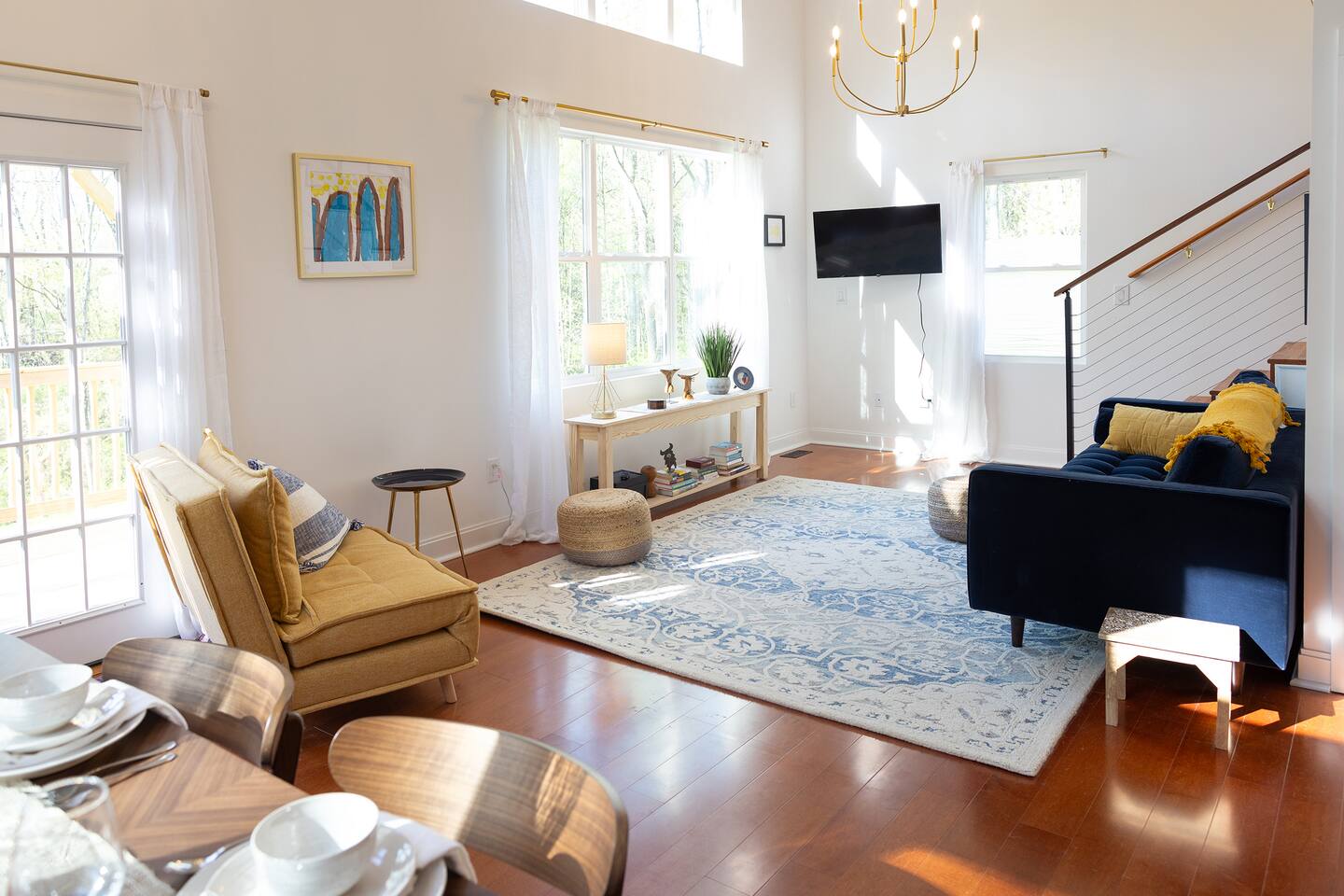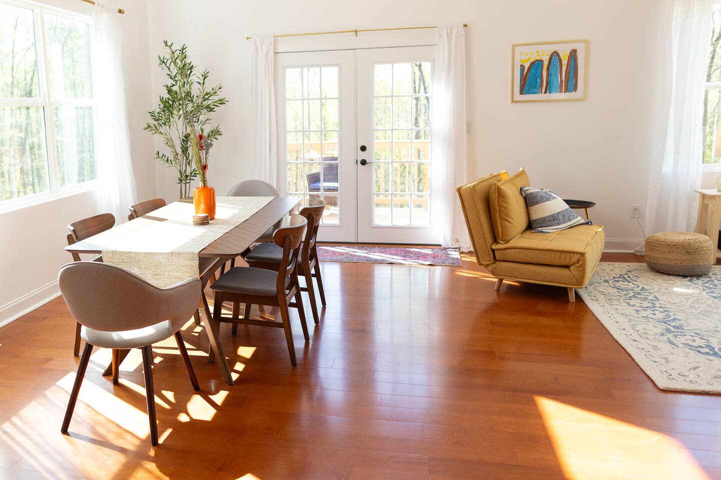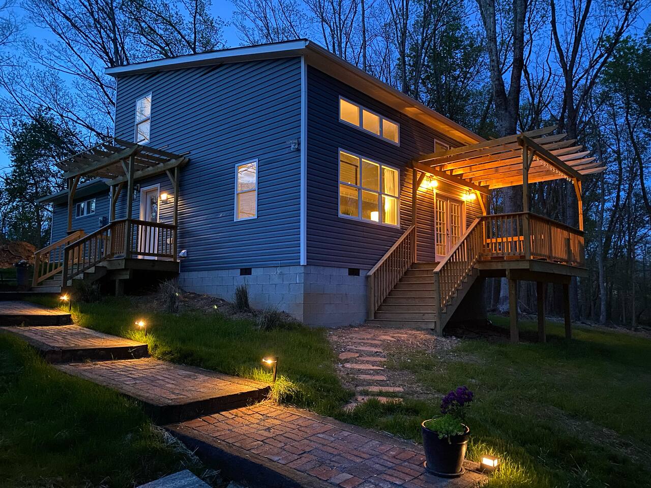 The brand new home contains two bedrooms and two baths, and sleeps 4 adults. Two queen bedrooms (one with an en suite full bathroom) are located on the second floor. The ground level contains a kitchen, open dining and living room, full bathroom, laundry closet, and a deck with pergola and outdoor seating. The house is fully stocked with linens, stoneware dishes, pot and pans, kitchen appliances, as well as extra pillows and blankets. There is a 40" Roku enabled TV in living room (bring your own login info for Netflix, etc). High speed wi-fi. Hardwood floors throughout. Hosts on site in entirely separate space, but are available if needed.