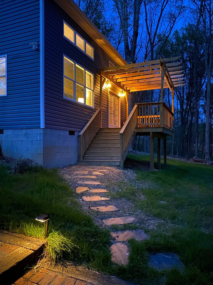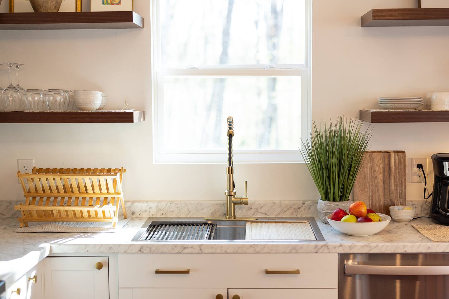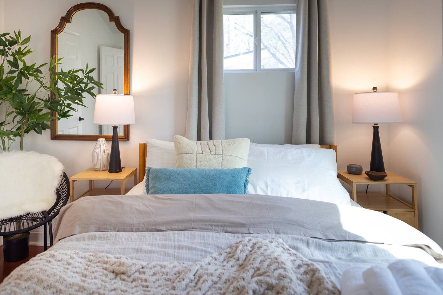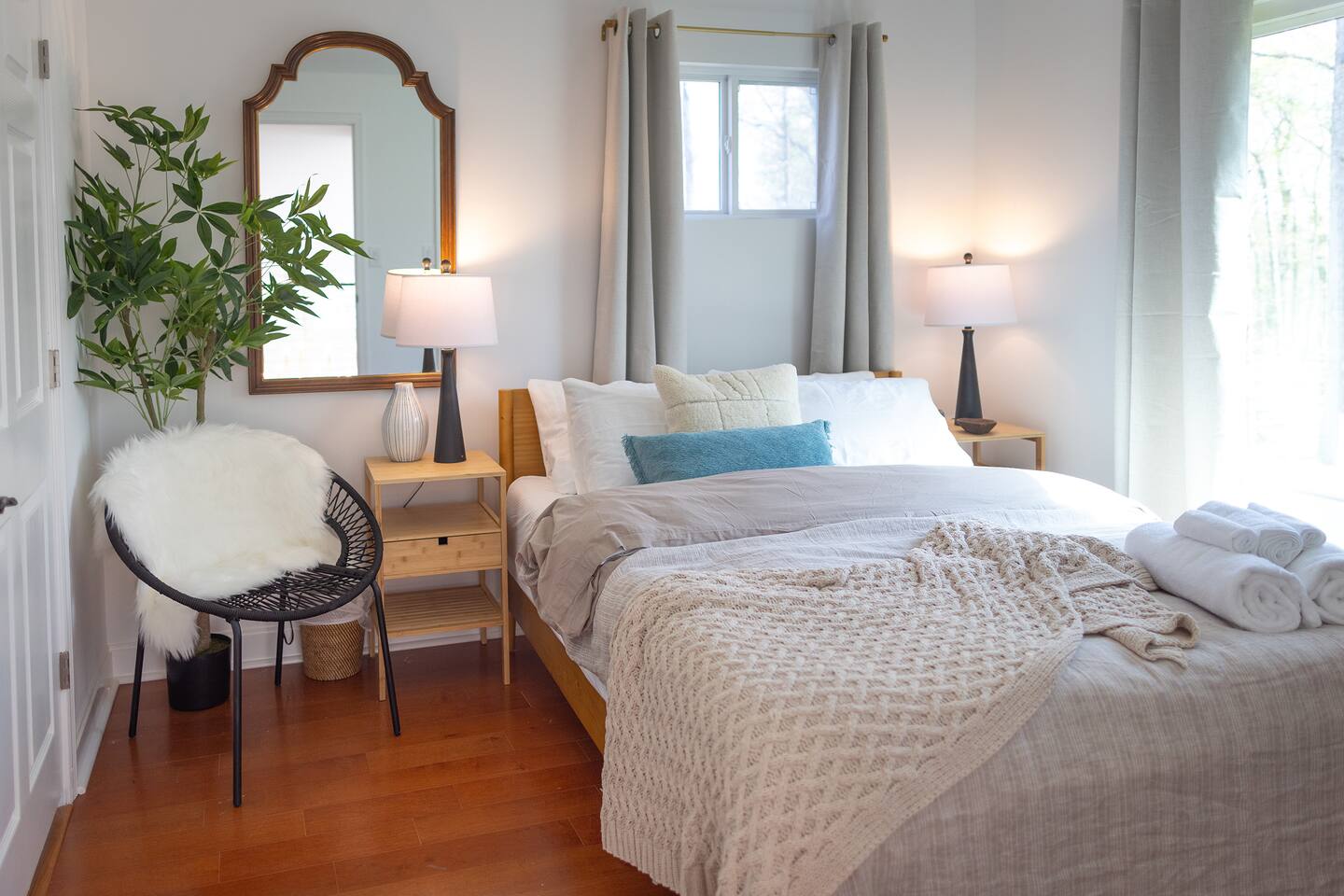 The brand new home contains two bedrooms and two baths, and sleeps 4 adults. Two queen bedrooms (one with an en suite full bathroom) are located on the second floor. The ground level contains a kitchen, open dining and living room, full bathroom, laundry closet, and a deck with pergola and outdoor seating. The house is fully stocked with linens, stoneware dishes, pot and pans, kitchen appliances, as well as extra pillows and blankets. There is a 40" Roku enabled TV in living room (bring your own login info for Netflix, etc). High speed wi-fi. Hardwood floors throughout. Hosts on site in entirely separate space, but are available if needed.
